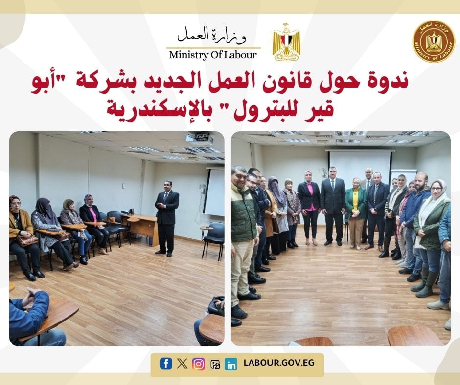 نظمت مديرية عمل الإسكندرية ندوة توعوية بشركة “أبو قير للبترول” لشرح أحكام عقد العمل الفردي وحقوق وواجبات العمال، بالإضافة إلى التعديلات الجديدة في نظام الإجازات لضمان استقرار بيئة العمل.
