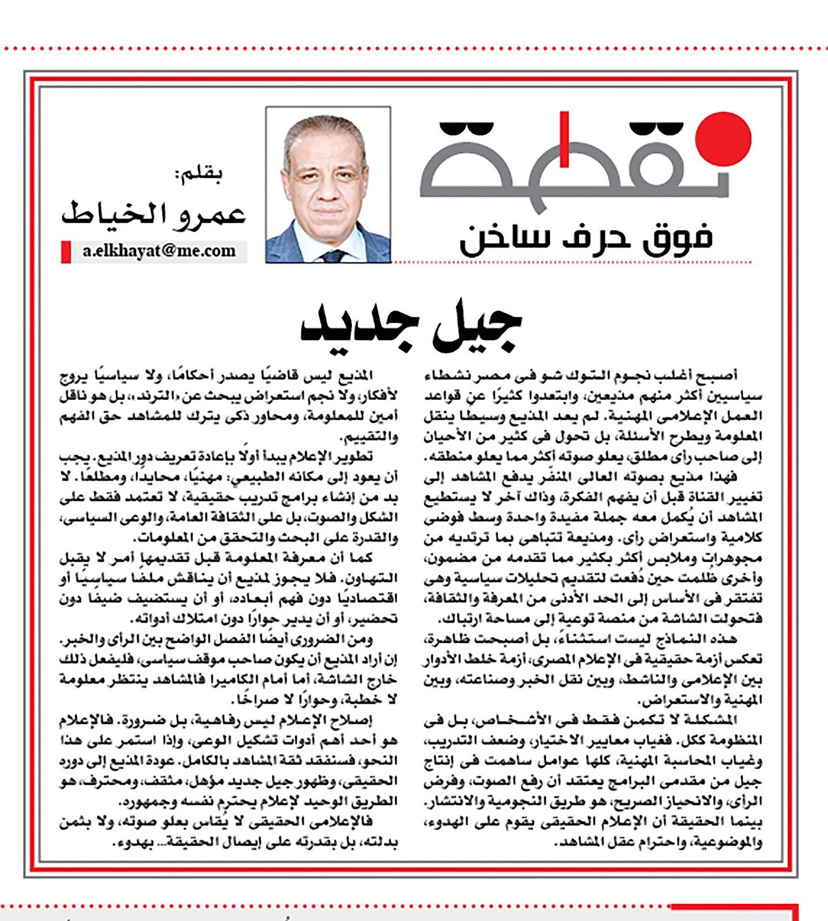 أكد الكاتب الصحفي عمرو الخياط في مقاله الأسبوعي أن إصلاح الإعلام أصبح ضرورة ملحة، فالإعلام يلعب دورًا كبيرًا في تشكيل وعي الناس، واستمرار الوضع الحالي سيؤدي لفقدان ثقة المشاهدين بشكل كامل. ولفت إلى أهمية عودة المذيع لدوره الحقيقي، وظهور جيل جديد من الإعلاميين المتمكنين والمثقفين، فهذا هو السبيل لإعلام يحترم نفسه وجمهوره، ويجب أن يكون الإعلامي ناقلًا أمينًا للمعلومات، ومحاورًا ذكيًا، يترك للمشاهد حرية الفهم والتقييم.