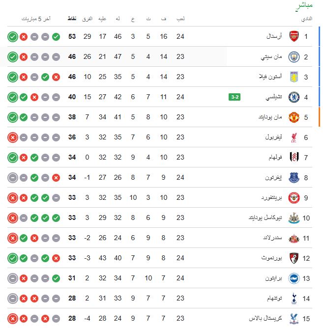 تشيلسي دلوقتي في المركز الخامس برصيد 37 نقطة، بينما ويست هام في المركز الثامن عشر بجدول ترتيب البريميرليج.