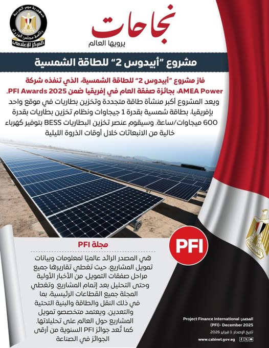 نشر المركز الإعلامي لمجلس الوزراء خبرًا مهمًا عن فوز مشروع “أبيدوس 2” للطاقة الشمسية في أسوان بجائزة صفقة العام في إفريقيا ضمن جوائز PFI لعام 2025، ويعتبر المشروع نموذجًا متقدمًا في استخدام الطاقة الشمسية بقدرة 1 جيجاوات، بالإضافة إلى أنظمة تخزين البطاريات بقدرة 600 ميجاوات/ساعة، مما سيوفر كهرباء نظيفة لأكثر من 500 ألف أسرة سنويًا، ومن المتوقع بدء التشغيل التجاري في يونيو 2026، ويعكس هذا الإنجاز نجاح برنامج “نُوَفِّي” في تعزيز التعاون بين الحكومة والقطاع الخاص ومؤسسات التمويل الدولية، كما يدعم استراتيجية مصر للطاقة المستدامة ورؤية مصر 2030 من خلال تسريع التحول للطاقة النظيفة وجذب الاستثمار الأخضر وتحقيق نمو اقتصادي مستدام، مما يؤكد قدرة مصر على قيادة مشاريع الطاقة المتجددة الكبرى في إفريقيا، ومن المقرر تقديم الجوائز والشهادات خلال حفل جوائز PFI الذي سيُقام في لندن يوم 19 فبراير 2026.