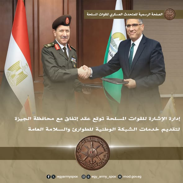 استمرارًا لتوجيهات الرئيس عبدالفتاح السيسي، تم توقيع عقد بين اللواء هاني محمود منصور، مدير إدارة الإشارة بالقوات المسلحة، والمهندس عادل النجار، محافظ الجيزة، لتقديم خدمات الشبكة الوطنية للطوارئ والسلامة العامة.
