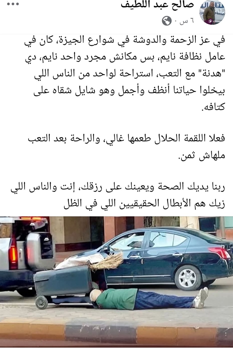 صورة بسيطة لعامل نظافة في الجيزة لفتت أنظار الكثيرين على مواقع التواصل الاجتماعي، حيث ظهر وهو يغفو أثناء أداء عمله وسط الزحام والضجيج، مما جعلها تثير تعاطف الناس بشكل كبير.