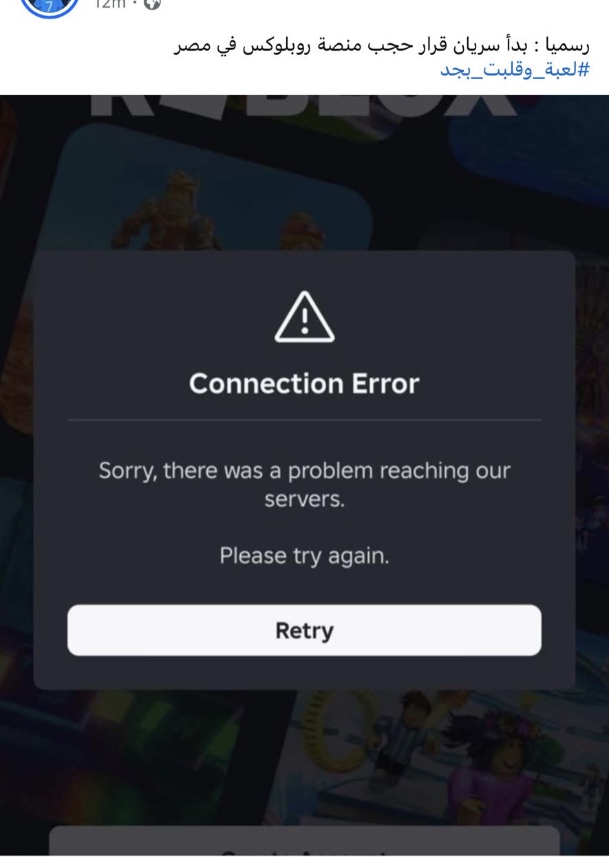 أعلنت السلطات المصرية عن حجب لعبة روبلوكس بشكل رسمي، وده تسبب في عدم قدرة المستخدمين على الدخول للعبة وظهور رسالة خطأ بدلاً من ذلك.