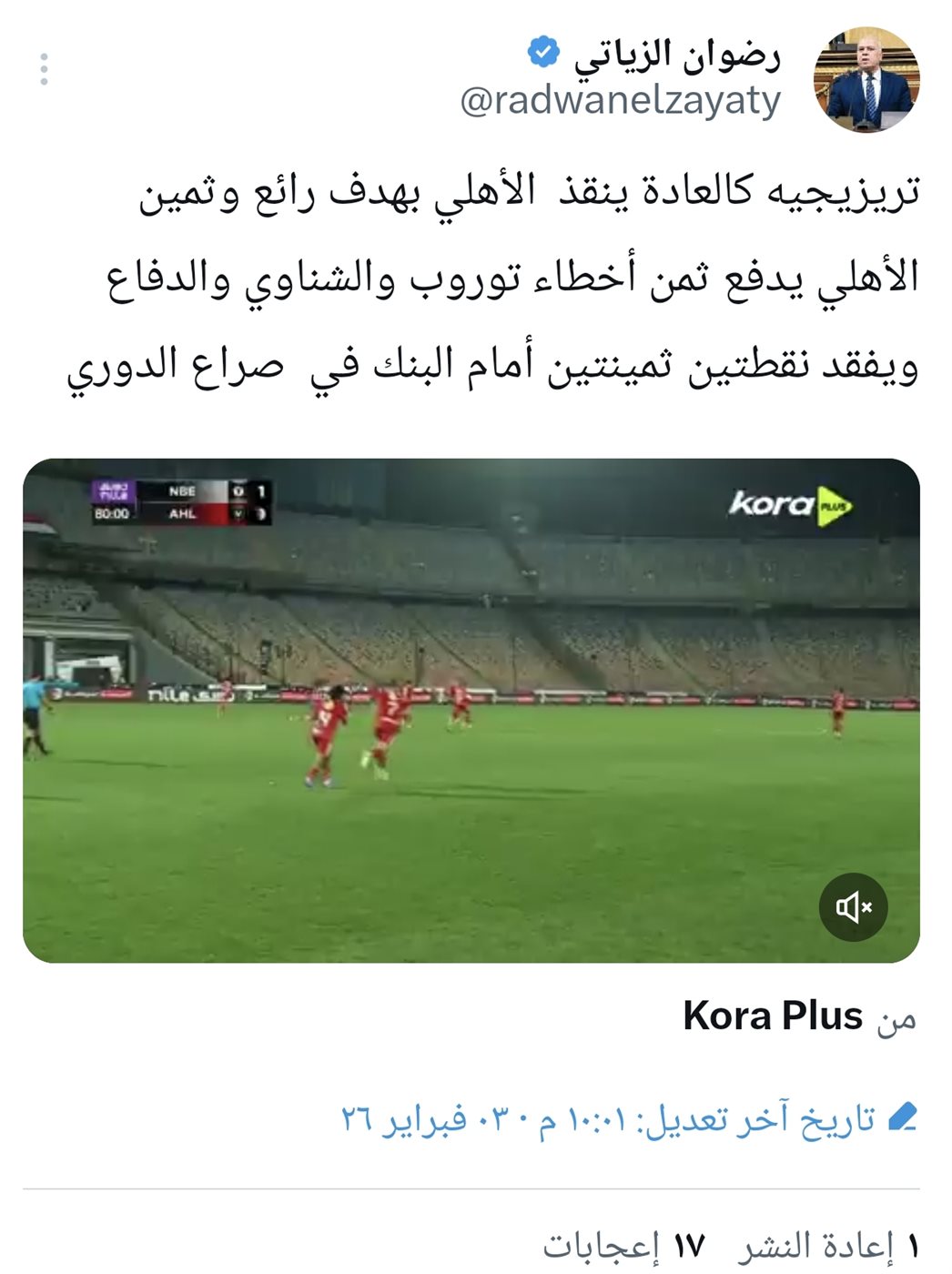 وفي سياق متصل، المحلل الرياضي رضوان الزياتي احتفى بهدف تريزيجيه، واعتبره إنقاذ للأهلي من الهزيمة، وكتب في تغريدة عبر حسابه على منصة إكس إن تريزيجيه كالعادة ينقذ الأهلي بهدف رائع وثمين، ولكنه أشار إلى أن الأهلي دفع ثمن أخطاء بعض اللاعبين.