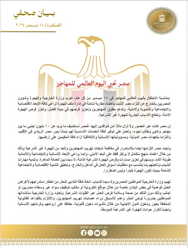 في يوم المهاجر العالمي الذي يُحتفل به في 18 ديسمبر، أكدت وزارة الخارجية والهجرة وشؤون المصريين بالخارج التزام مصر بتبني نهج شامل في إدارة ملف الهجرة، يراعي جميع الجوانب الاقتصادية والاجتماعية والتنموية والأمنية ويعزز حقوق المهاجرين.
