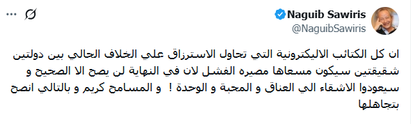 ساويرس حذر من أن الكتائب الإلكترونية تستغل الخلاف الحالي لتحقيق مكاسب شخصية، ودعا الجميع لتجاهل هذه المحاولات وعدم الانجراف وراءها، قائلًا: «المسامح كريم، وأنصح بتجاهل هذه الحملات».