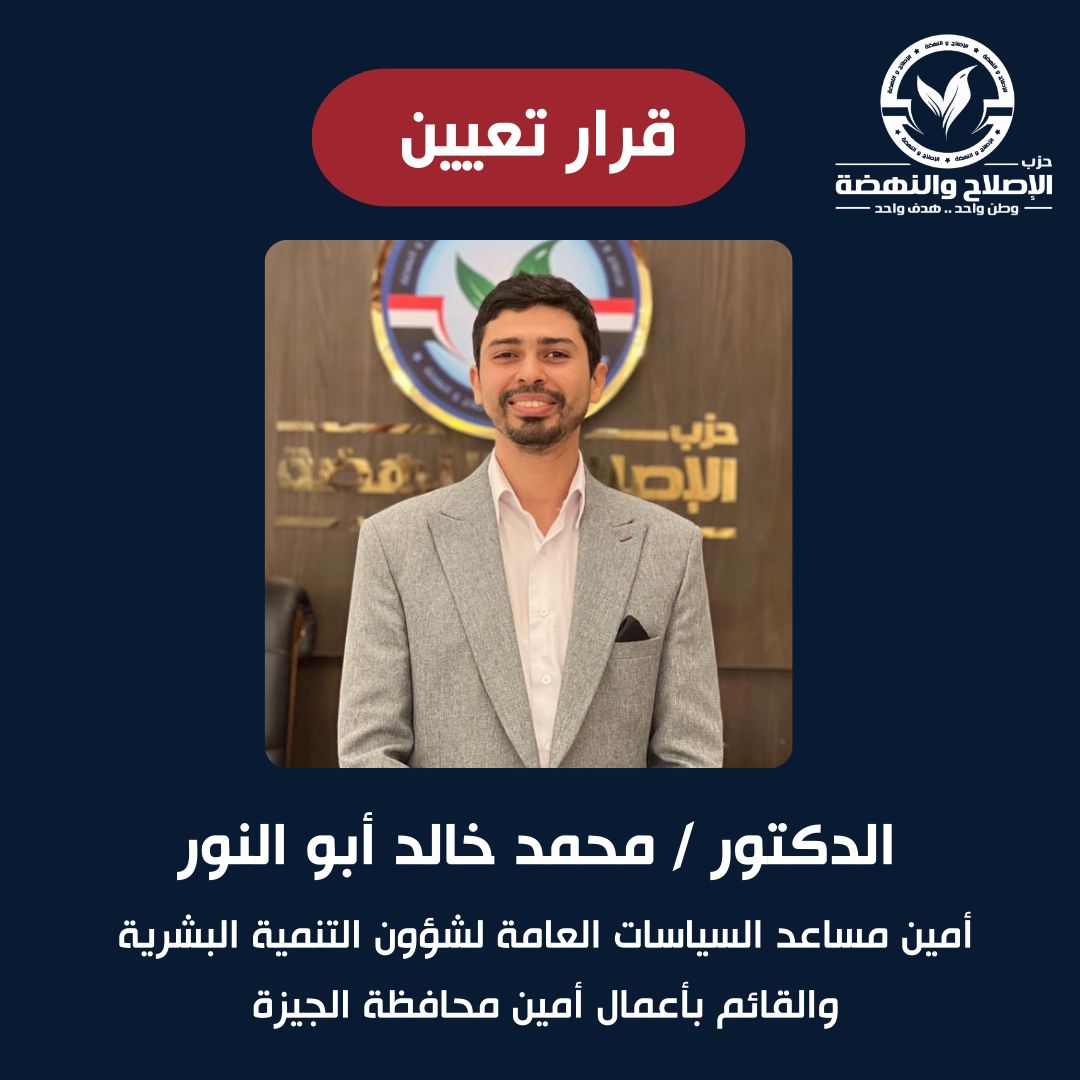 تعيين الدكتور محمد خالد أبوالنور أمينًا مساعدًا للسياسات العامة لشؤون التنمية البشرية، والقائم بأعمال أمين محافظة الجيزة.