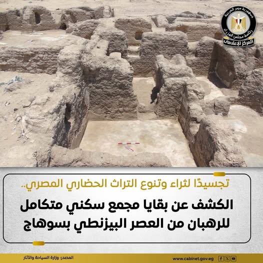 كشفت البعثة الأثرية المصرية التابعة للمجلس الأعلى للآثار عن بقايا مجمع سكني متكامل للرهبان في موقع “القرية بالدوير” بمركز طما في محافظة سوهاج، ويعود هذا الاكتشاف إلى فترة العصر البيزنطي ويأتي ضمن أعمال الحفائر الجارية في الموقع.