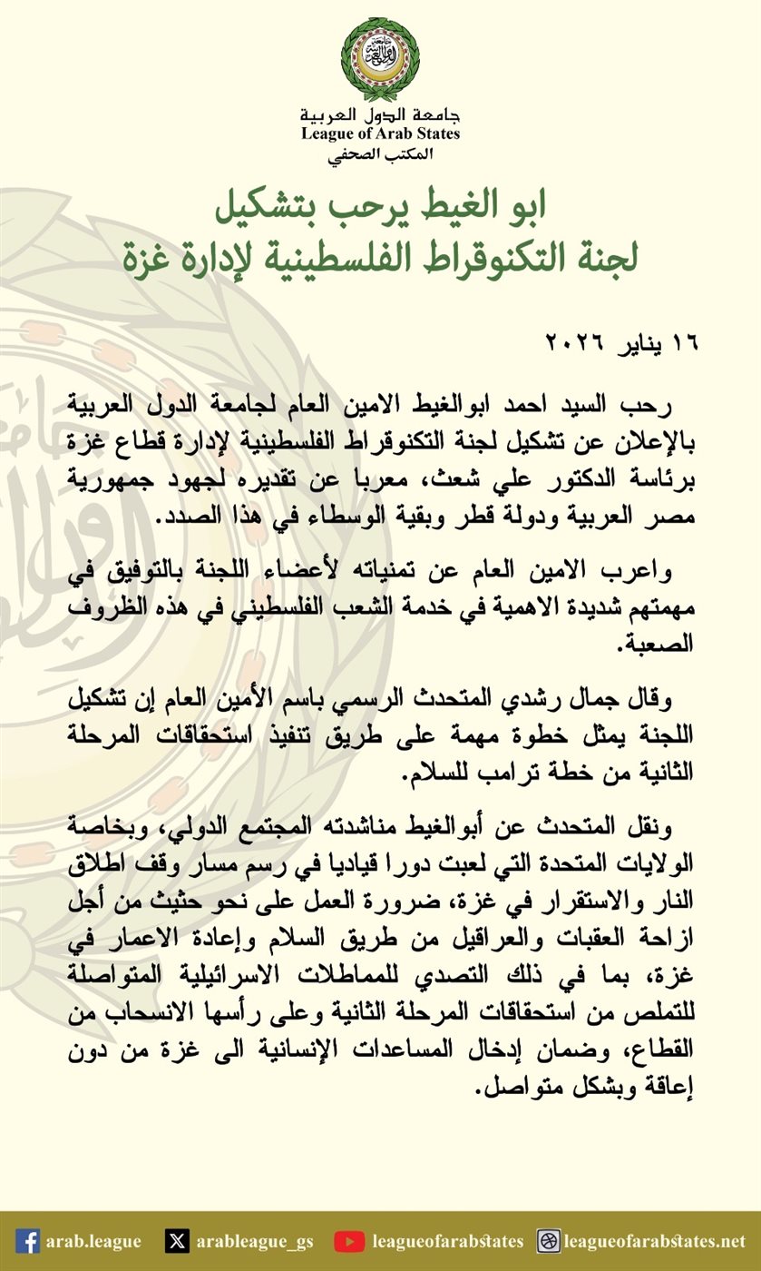 أحمد أبو الغيط، الأمين العام لجامعة الدول العربية، أعرب عن ترحيبه بتشكيل لجنة التكنوقراط الفلسطينية لإدارة قطاع غزة برئاسة الدكتور علي شعث، وأثنى على جهود مصر وقطر في هذا الإطار.
