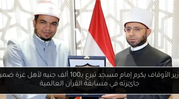 وزير الأوقاف يكرم إمام مسجد تبرع بـ100 ألف جنيه لأهل غزة ضمن جائزته في مسابقة القرآن العالمية