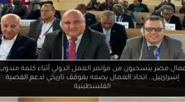 عمال مصر ينسحبون من مؤتمر العمل الدولي أثناء كلمة مندوب إسرائيل.. اتحاد العمال يصفه بموقف تاريخي لدعم القضية الفلسطينية