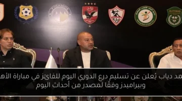 أحمد دياب يُعلن عن تسليم درع الدوري اليوم للفائز في مباراة الأهلي وبيراميدز وفقًا لمصدر من أحداث اليوم