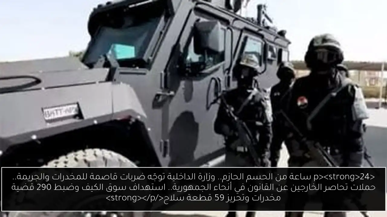 24 ساعة من الحسم الحازم.. وزارة الداخلية توجّه ضربات قاصمة للمخدرات والجريمة.. حملات تحاصر الخارجين عن القانون في أنحاء الجمهورية.. استهداف سوق الكيف وضبط 290 قضية مخدرات وتحريز 59 قطعة سلاح
