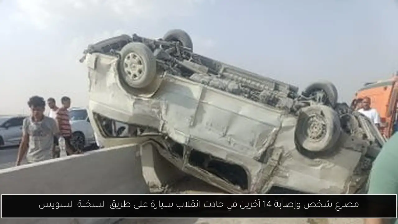 مصرع شخص وإصابة 14 آخرين في حادث انقلاب سيارة على طريق السخنة السويس