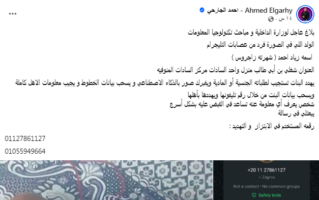 تتضمن المناشدة تفاصيل دقيقة عن المدعو “زياد أحمد” المعروف بـ “زاغروس” الذي يُعتبر جزءًا من عصابات التليجرام التي تستهدف تشويه سمعة الفتيات.