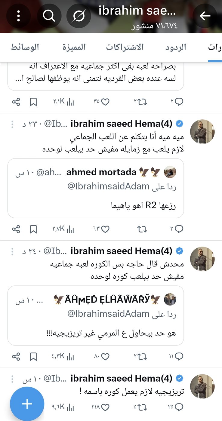 سعيد كتب على حسابه في منصة إكس، إنه يتمنى أن تريزيجيه يلعب بشكل أفضل ويتعاون مع باقي زملائه، مشددًا على أهمية اللعب الجماعي، لأن كل لاعب محتاج يشتغل مع الفريق عشان يحققوا نتيجة إيجابية.