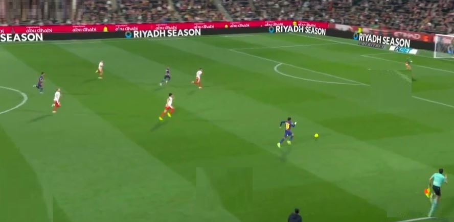 وفي الدقيقة 43، رافينيا كاد يسجل لكن الكرة اصطدمت بالقائم، وضغط برشلونة كان مستمر لكن دفاع جيرونا صمد. قبل نهاية الشوط الأول، لامين يامال أضاع ركلة جزاء بعد ما اصطدمت في القائم الأيسر، لينتهي الشوط الأول بالتعادل (0/0).