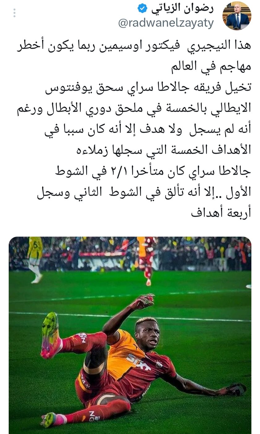 وقال الزياتي، عبر حسابه على منصة «إكس»، إن أوسيمين كان له دور كبير في فوز جالاطا سراي على يوفنتوس بخمسة أهداف مقابل هدفين في ملحق دوري أبطال أوروبا، رغم عدم تسجيله أي هدف في اللقاء.
