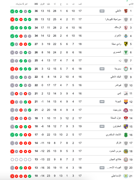 زد في المركز السابع برصيد 25 نقطة من 17 مباراة، ومتساوي مع سموحة اللي في المركز الثامن بنفس الرصيد لكن من 18 مباراة.