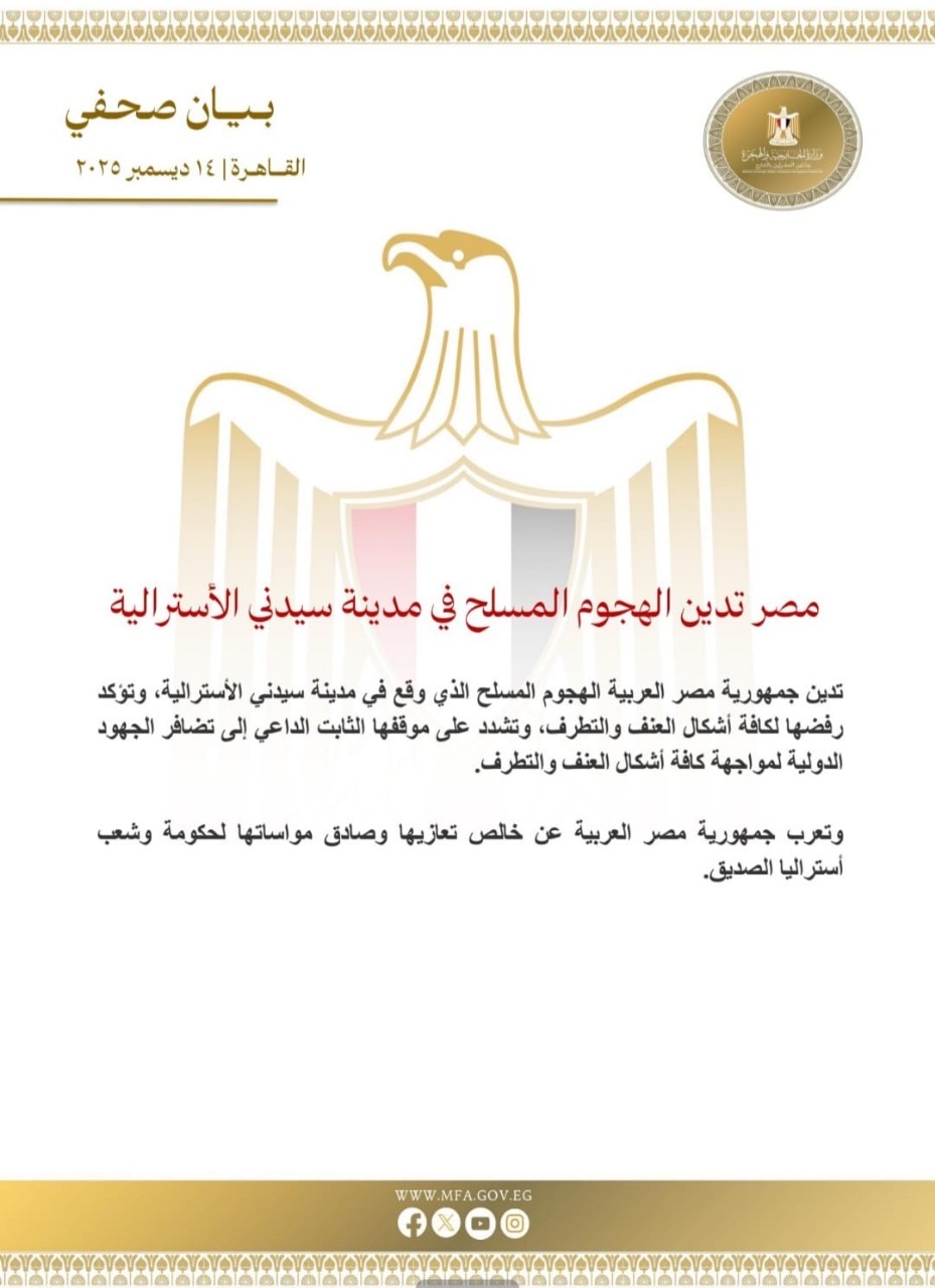أدانت مصر الهجوم المسلح الذي حدث في مدينة سيدني الأسترالية، معبرة عن رفضها التام للعنف والتطرف، وأكدت على أهمية تكاتف الجهود الدولية لمواجهة هذه الظواهر السلبية.