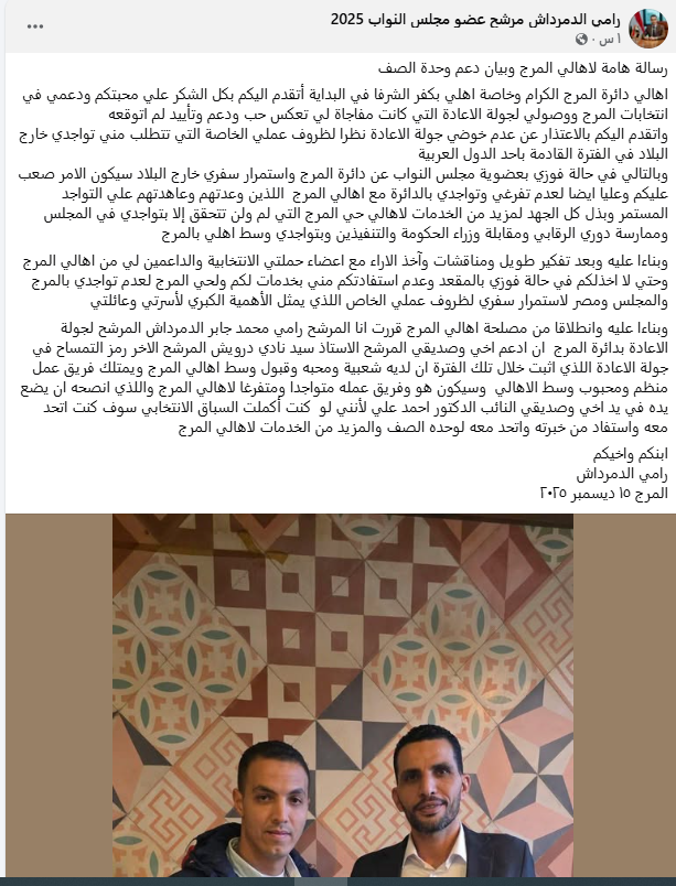 أعلن رامي محمد جابر الدمرداش، مرشح مجلس النواب عن دائرة المرج، انسحابه من جولة الإعادة لانتخابات 2025، بسبب ظروف عمله خارج البلاد، مما يمنعه من التفرغ لخدمة أهالي الدائرة بشكل كامل.