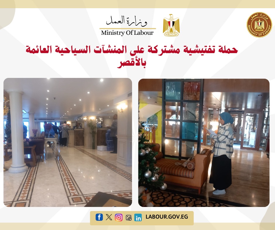 شاركت مديرية عمل الأقصر في لجنة موسعة للتفتيش على 11 منشأة سياحية عائمة، للتأكد من اشتراطات السلامة والصحة المهنية، وأوضح مدير المديرية محمود باسل أن المشاركة تهدف لحماية العمال والسياح وتوفير مناخ عمل آمن يدعم الاستثمار السياحي كعنصر هام للدخل القومي.