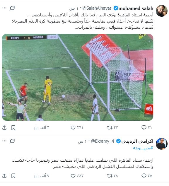وفي نفس السياق، انتقد الإعلامي الرياضي إبراهيم فايق أرضية الاستاد أثناء مباراة منتخب مصر مع نيجيريا، وكتب في تغريدة له عبر إكس: “أرضية استاد القاهرة عاملة كده ليه؟”