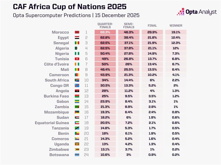 حسب إحصائيات أوبتا، منتخب مصر محتاج يركز لأنه في المركز الثاني كمرشح للفوز بكأس أمم إفريقيا بنسبة 12.4%، وده بعد المغرب اللي في المركز الأول بنسبة 19.1%.