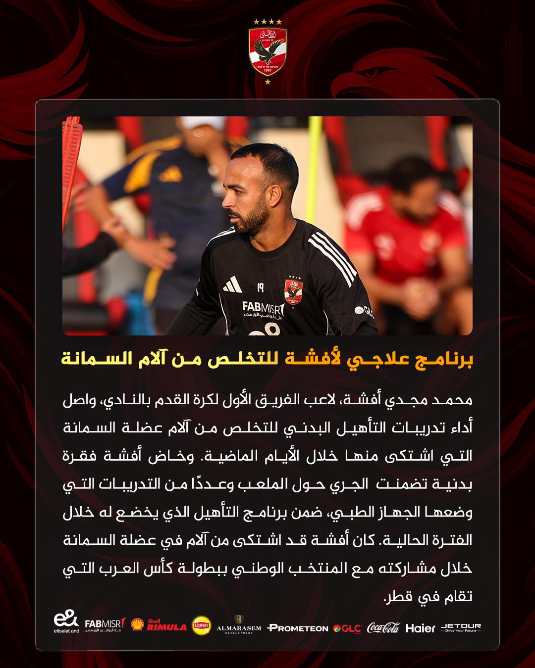 محمد مجدي أفشة، لاعب الأهلي، مستمر في تدريباته التأهيلية بعد معاناته من آلام في عضلة السمانة خلال الأيام الماضية، وبيسعى يرجع بأسرع وقت للملاعب.