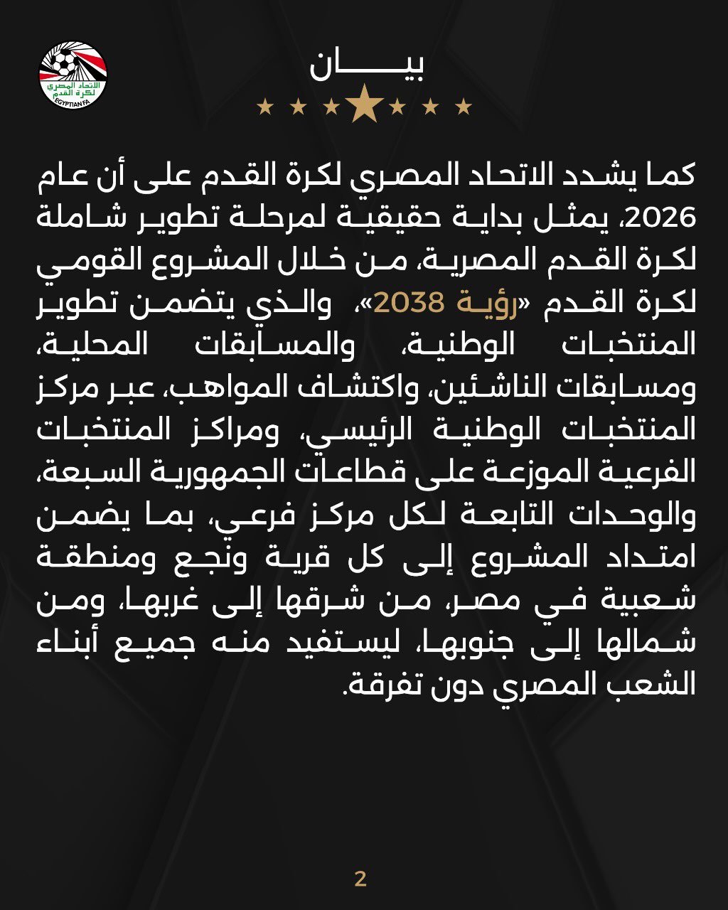 كمان، الاتحاد ذكر إن عام 2026 هيكون نقطة انطلاق حقيقية لتطوير شامل لكرة القدم المصرية، من خلال مشروع “رؤية 2038″، اللي هيشمل تطوير المنتخبات والمسابقات المحلية والناشئين، واكتشاف المواهب في كل أنحاء الجمهورية، عشان يستفيد منه كل المصريين بلا استثناء.