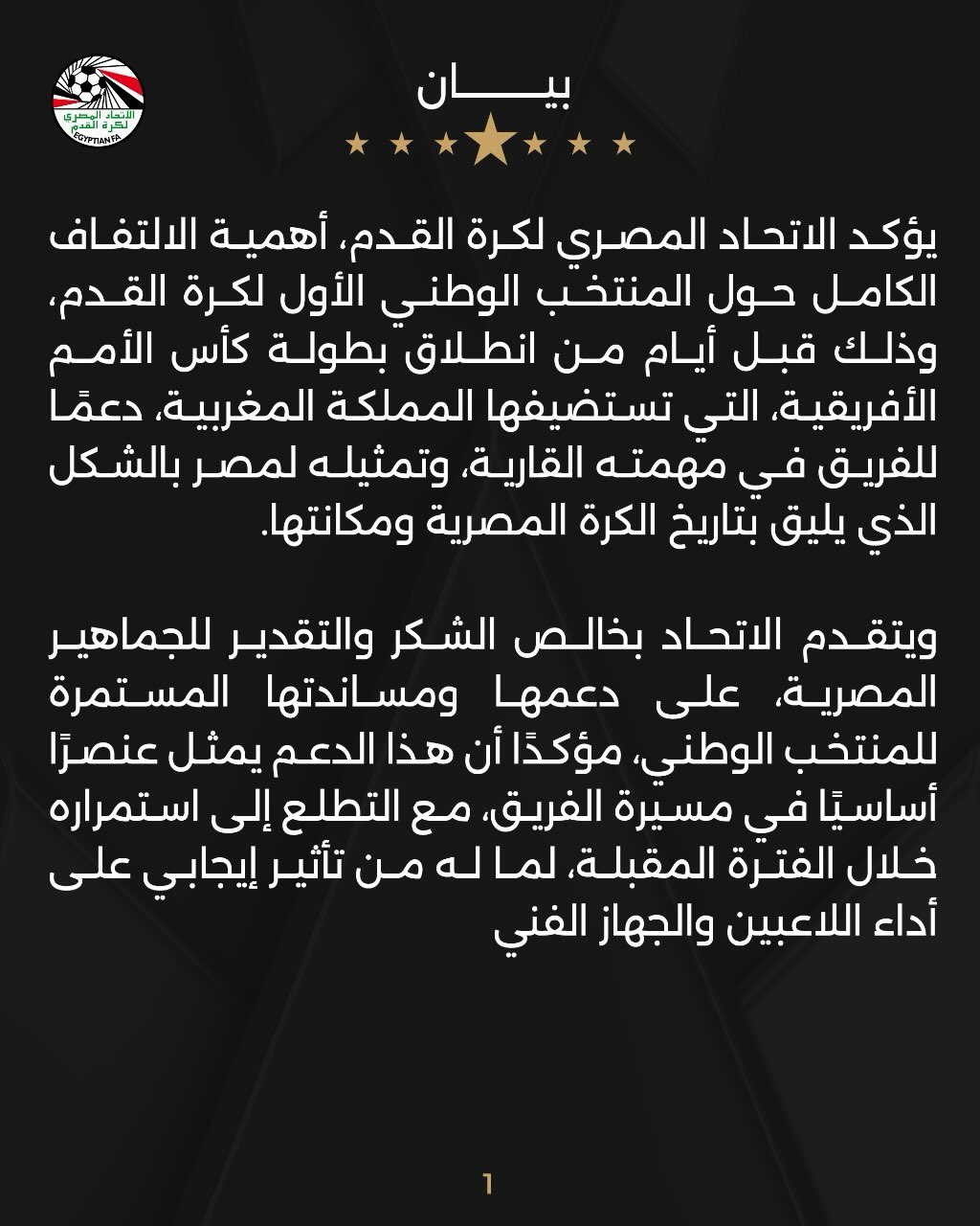الاتحاد قدم شكره للجماهير على الدعم الدائم للمنتخب، وأكد إن هذا الدعم جزء مهم في نجاح الفريق، وإنه يأمل في استمراره عشان ينعكس بشكل إيجابي على أداء اللاعبين والجهاز الفني في البطولة.