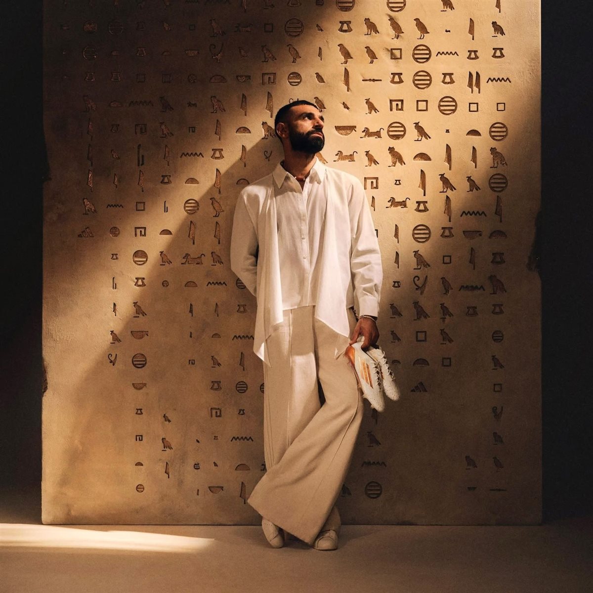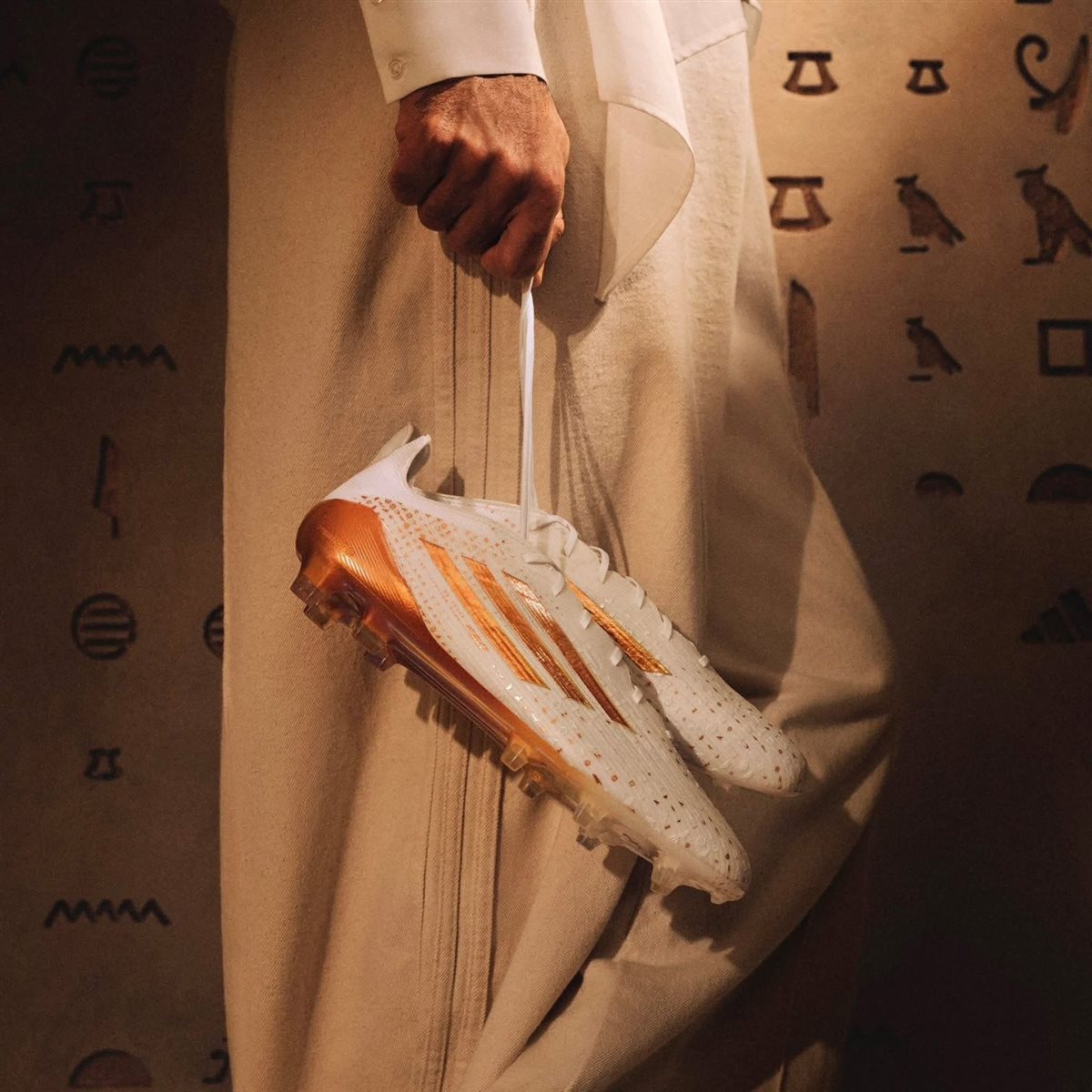 الحذاء الجديد لمحمد صلاح جاي باللون الأبيض، مع خطوط ذهبية من أديداس، واللي هتضيف لمسة فخامة لإطلالة الفرعون المصري في الملعب.