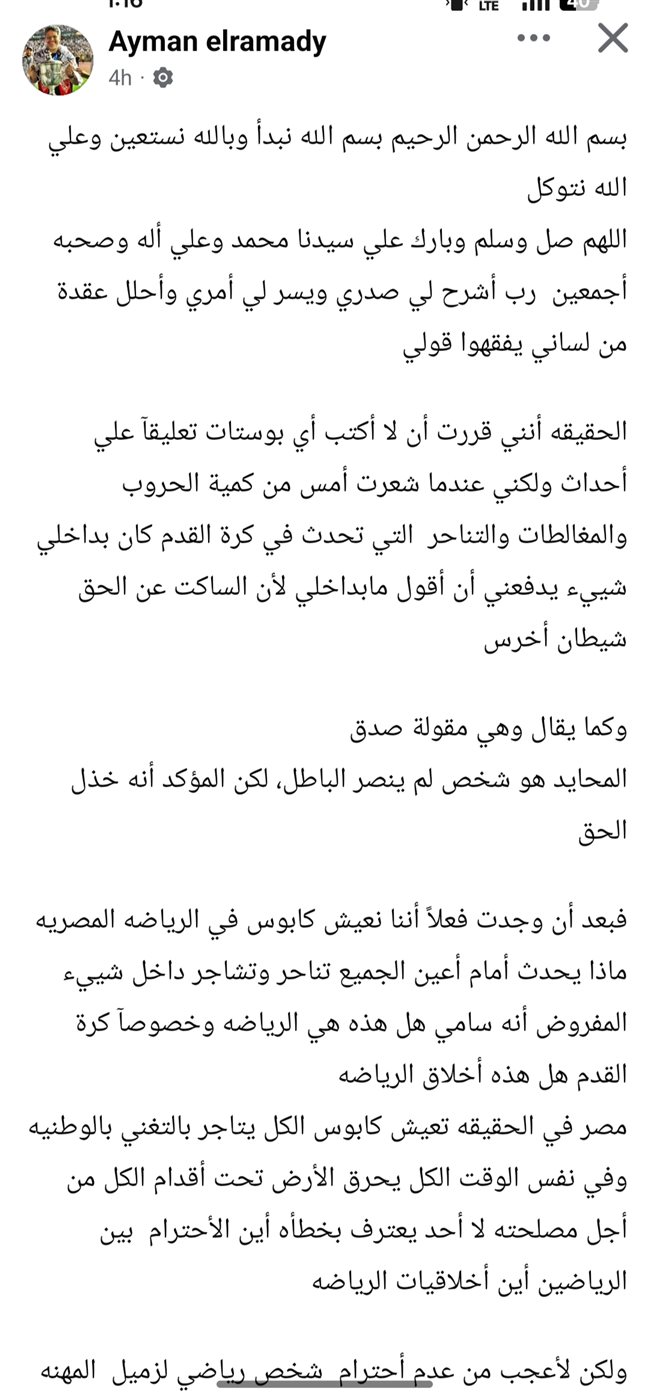 كتب أيمن الرمادي على صفحته في فيسبوك إنه كان ناوي ما يتكلمش، لكن كمية المشاكل اللي شافها في الكورة دفعته إنه يعبر عن رأيه، ويقول “الساكت عن الحق شيطان أخرس”.
