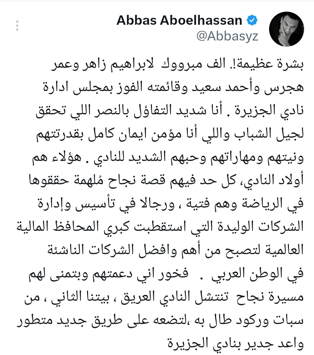 عباس نشر تغريدة عبر صفحته الرسمية على “إكس”، قال فيها: “ألف مبروك لإبراهيم زاهر وعمر هجرس وأحمد سعيد على فوزهم بمجلس إدارة نادي الجزيرة. أنا متفائل جدًا بما حققه جيل الشباب، وهؤلاء أولاد النادي ولهم قصص نجاح ملهمة في الرياضة، وفخور إني دعمتهم وأتمنى لهم مسيرة ناجحة للنادي، بيتنا الثاني”