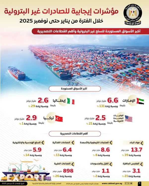 وكشفت الإنفوجرافات عن زيادة قيمة الصادرات غير البترولية بنسبة 18.4%، لتصل إلى 44.4 مليار دولار خلال الفترة من يناير إلى نوفمبر 2025، مقارنة بـ 37.5 مليار دولار في نفس الفترة من 2024.