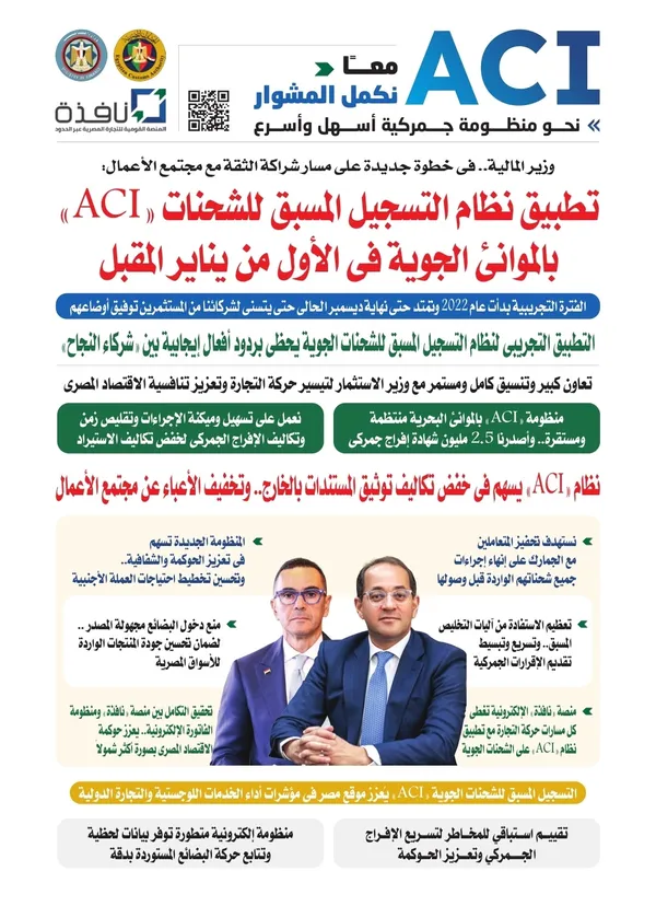 تطبيق نظام ACI على الشحنات الجوية يعزز من مكانة مصر في مؤشرات أداء الخدمات اللوجستية والتجارة الدولية، ويساعد على تسريع الإفراج الجمركي وتحقيق أعلى درجات الانضباط.