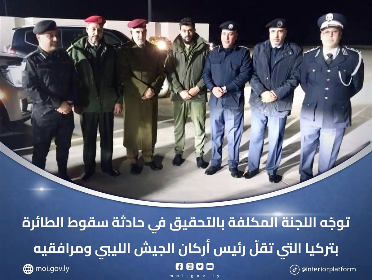 غادرت لجنة رسمية من وزارة الداخلية الليبية برئاسة لواء محمود عاشور العجيلي إلى تركيا للتحقيق في حادث سقوط الطائرة التي كانت تقل رئيس أركان الجيش الليبي الفريق محمد الحداد ومرافقيه.