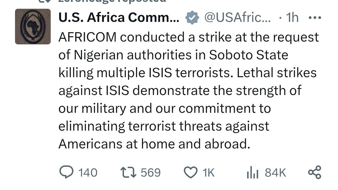 في البيان الأصلي الذي نشرته القيادة الأمريكية في إفريقيا (أفريكوم) على منصة “إكس”، تم ذكر أن الضربات تمت “بناءً على طلب” السلطات النيجيرية، ولكن بعد ساعة، تم تعديل البيان ليشير إلى أن الهجوم نُفذ “بالتنسيق” مع السلطات النيجيرية.