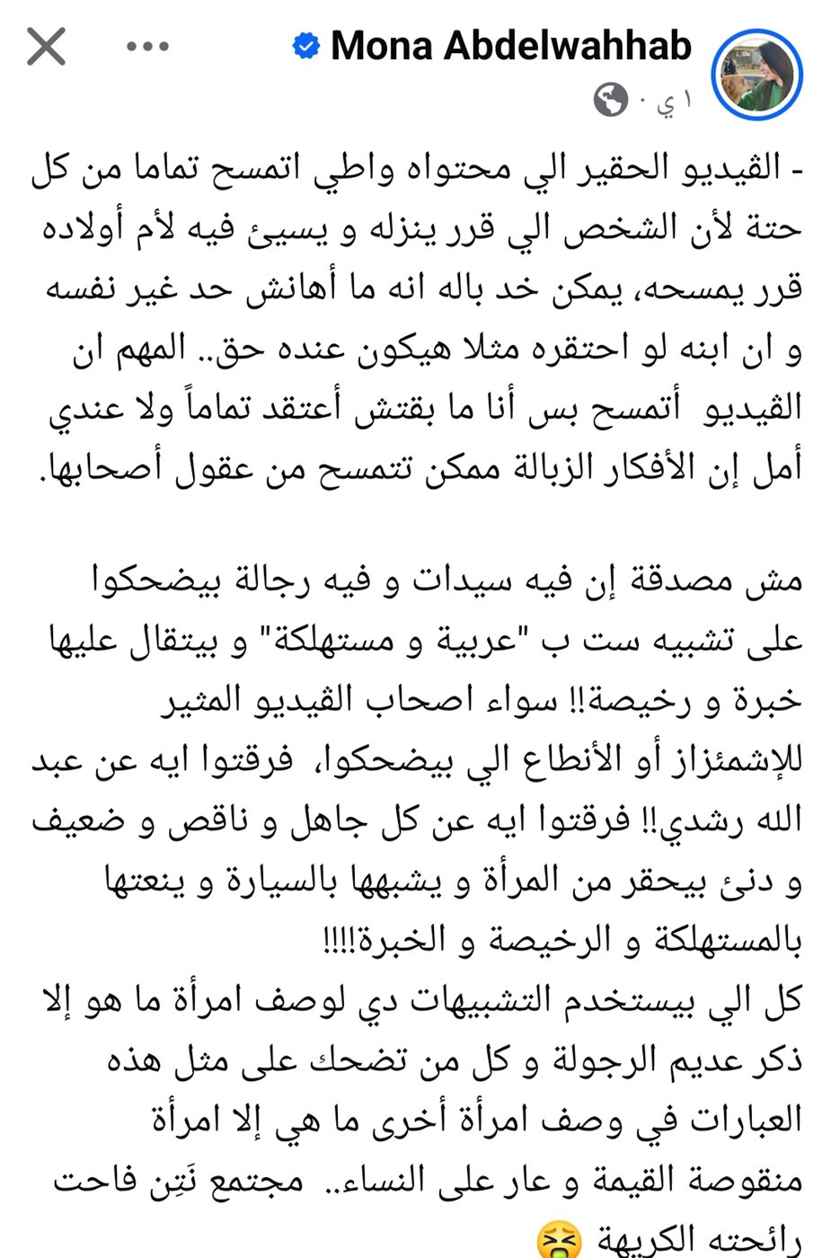 انتقدت الإعلامية منى عبدالوهاب ظهور أحد الرجال في فيديو اتهم فيه طليقته بألفاظ مهينة، واعتبرت أن حذف الفيديو لا يغير من خطورة الأفكار التي تحرض على إهانة المرأة وتقليل شأنها.