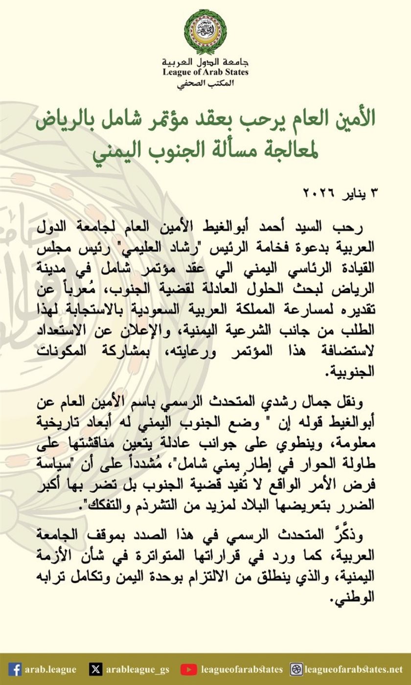وفي تصريح لجمال رشدي المتحدث الرسمي باسم الأمين العام، أكد أبو الغيط أن وضع الجنوب اليمني له أبعاد تاريخية معروفة، ويجب مناقشة الجوانب العادلة المتعلقة به على طاولة الحوار في إطار يمني شامل، مشددًا على أن سياسة فرض الأمر الواقع لا تفيد القضية بل تزيد من التشرذم والتفكك.