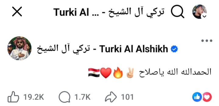 تفاعل تركي آل الشيخ، رئيس الهيئة العامة للترفيه في السعودية، مع فوز منتخب مصر على بنين في المباراة التي انتهت منذ قليل ضمن دور الـ16 في كأس الأمم الإفريقية، وأشاد بأداء محمد صلاح.
