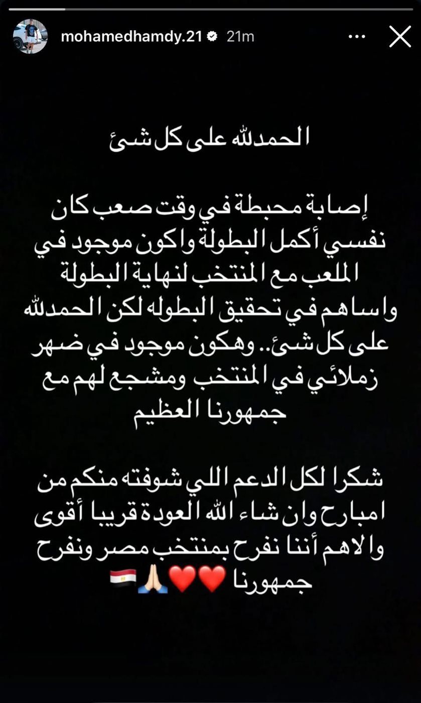 حمدي، في رسالة مؤثرة نشرها على “إنستجرام”، عبر عن الألم النفسي اللي حاسس به، واعتبر الإصابة محبطة في وقت حساس، وعبّر عن أمله في استكمال مشواره مع المنتخب حتى التتويج.