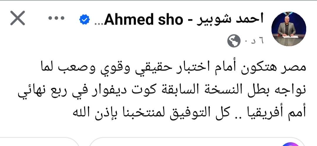 شوبير قال في منشور له على فيس بوك: “مصر هتكون أمام اختبار حقيقي وصعب لما نواجه بطل النسخة السابقة كوت ديفوار في ربع نهائي أمم أفريقيا.. كل التوفيق لمنتخبنا بإذن الله”