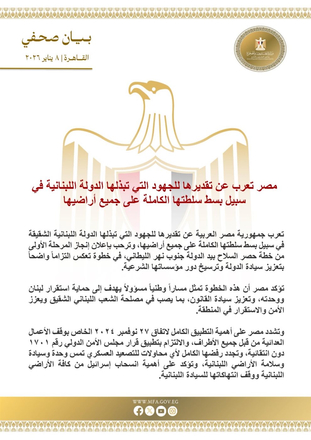 أعربت مصر عن تقديرها للجهود التي تبذلها لبنان لتعزيز سلطتها على أراضيها، حيث رحبت بإعلان إنجاز المرحلة الأولى من خطة حصر السلاح بيد الدولة جنوب نهر الليطاني، مما يعكس التزامًا بتعزيز سيادة الدولة.
