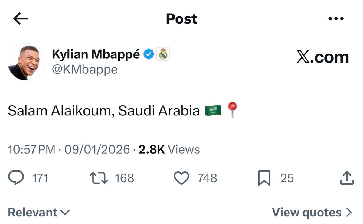 كتب مبابي على حسابه الرسمي بمجرد وصوله للسعودية “سلام عليكم” مع علم المملكة العربية السعودية، وده يبين حماسه للحدث الكبير.