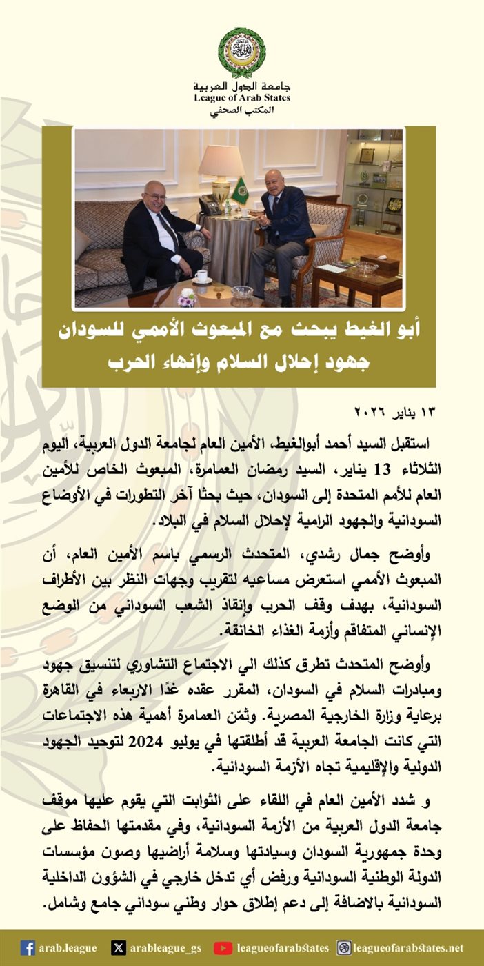 أضاف المتحدث أن اللقاء تناول أيضًا الاجتماع التشاوري لتنسيق جهود ومبادرات السلام في السودان، المقرر عقده غدًا الأربعاء في القاهرة برعاية وزارة الخارجية المصرية، وأكد العمامرة أهمية هذه الاجتماعات التي أطلقتها الجامعة العربية في يوليو 2024 لتوحيد الجهود الدولية والإقليمية تجاه الأزمة السودانية.