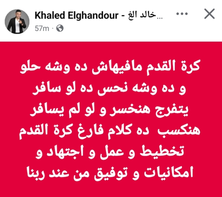 كتب الغندور على صفحته في فيسبوك: “كرة القدم مفيهاش حظ، لو سافروا يتفرجوا هنخسر، ولو ما سافروش هنكسب، ده كلام فارغ. كرة القدم محتاجة تخطيط وعمل واجتهاد وتوفيق من ربنا”