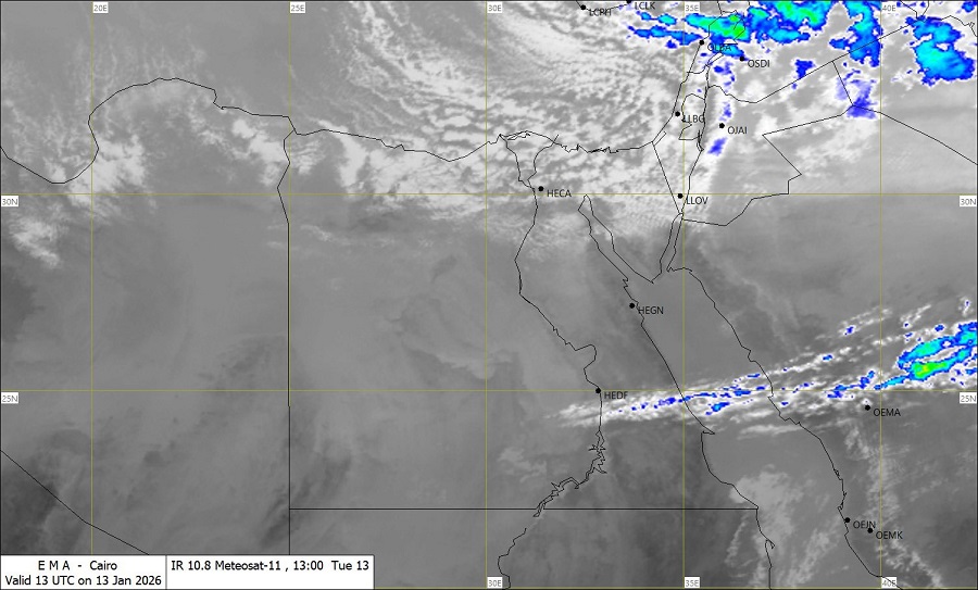 تشير صور الأقمار الصناعية إلى أجواء باردة ونشاط رياح يزيد من الإحساس ببرودة الطقس على أغلب الأنحاء، مما يؤثر على الملاحة البحرية في البحر المتوسط، مع استمرار تكاثر السحب المنخفضة والمتوسطة على مناطق متفرقة من شمال البلاد، وقد يصاحبها فرص سقوط أمطار متفاوتة الشدة على مناطق مختلفة، مع فرص ضعيفة لأمطار خفيفة على مناطق محدودة في القاهرة الكبرى.