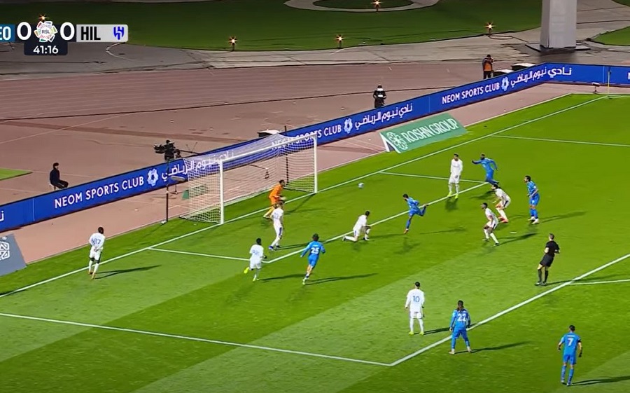 المباراة بدأت بسيطرة واضحة من الهلال، اللي استحوذ على الكرة بنسبة 70% مقابل 30% لنيوم في أول ربع ساعة، وكان فيه ضغط قوي من نيوم عشان يسجل هدفه الأول من تسديدة قوية تهدد مرمى الهلال.