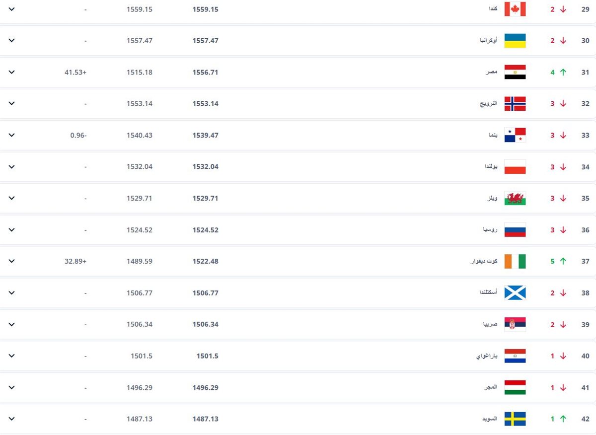 مصر تقدمت 4 مراكز في التصنيف الشهري، ليصبح رصيدها 1556.71 نقطة، بعدما كانت في المركز 35.